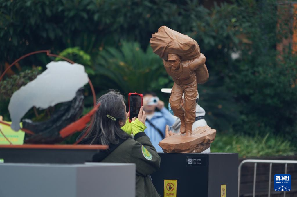 10月24日,观众在2025年全国青少年雕塑艺术作品展上的雕塑作品合影。 10月24日,“蜀韵备战,谱写时代新篇章——2025全国青年雕塑艺术展”在四川成都东郊的成都记忆舞台开幕。作为第十四届中国艺术节配套活动之一,本次展览汇集了来自全国各地青年艺术家和儿童的99件雕塑佳作,为公共艺术注入青春活力。新华社记者 唐文浩 摄