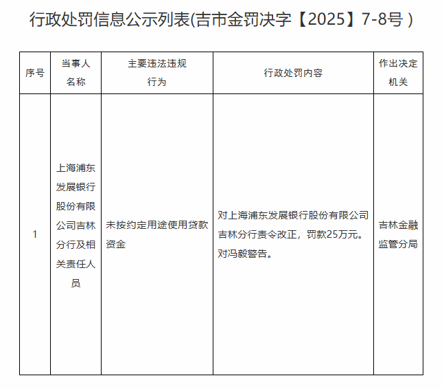 中国经济网络北京,9月26日。国家金融监督政府的吉林金融监督部门在26日发布了行政罚款信息的披露清单(Jicheng Jinyue Disage No. [2025]第7-8号)。上海Pudong Development Bank Co,Ltd(因此,从称为“ PU Development Bank”,600000.SH)Jilin分支机构和相关负责的员工具有以下主要的非法和不规则行为:未能将贷款资金用于商定的目标。吉林金融监督局已决定命令上海Pudong Development Bank Co,Ltd的Jilin分行,以纠正问题并惩罚25万元人民币;并警告冯YI。以下是理论文本: