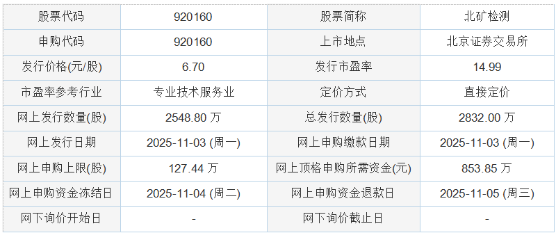 北康检测技术股份有限公司保荐人(主承销商):中信证券股份有限公司 发行情况: 公司简介:公司是国内领先的有色金属检验检测技术服务和技术开发及技术研发企业之一。业务涵盖矿石及矿产品、冶炼产品、环境样品、再生资源、先进材料、冶炼剂检验检测、检验检测技术研发与标准化、技术推广、高端分析仪器研发等领域。截至招股说明书签署日,矿冶集团直接持有公司股份86.11%,通过矿冶总院间接持有公司股份1.53%。它举办了合计持有公司87.64%的股份,为公司控股股东。国资委、国管委持有矿冶集团100%的股份,是公司的实际控制人。北康检测2025年10月30日披露的向不特定合格投资者公开发行股票并在北京证券交易所上市的招股说明书显示,公司拟募集资金17,879.78万元,用于北康检测先行测试。北康检测2025年10月30日披露的向不特定合格投资者公开发行股票并在北京证券交易所上市的公告显示,若本次发行成功,公司预计将募集资金总额18974.4万元。扣除预计发行费用1726.9万元(不含增值税)后,预计资金净额募集资金17247.5万元。